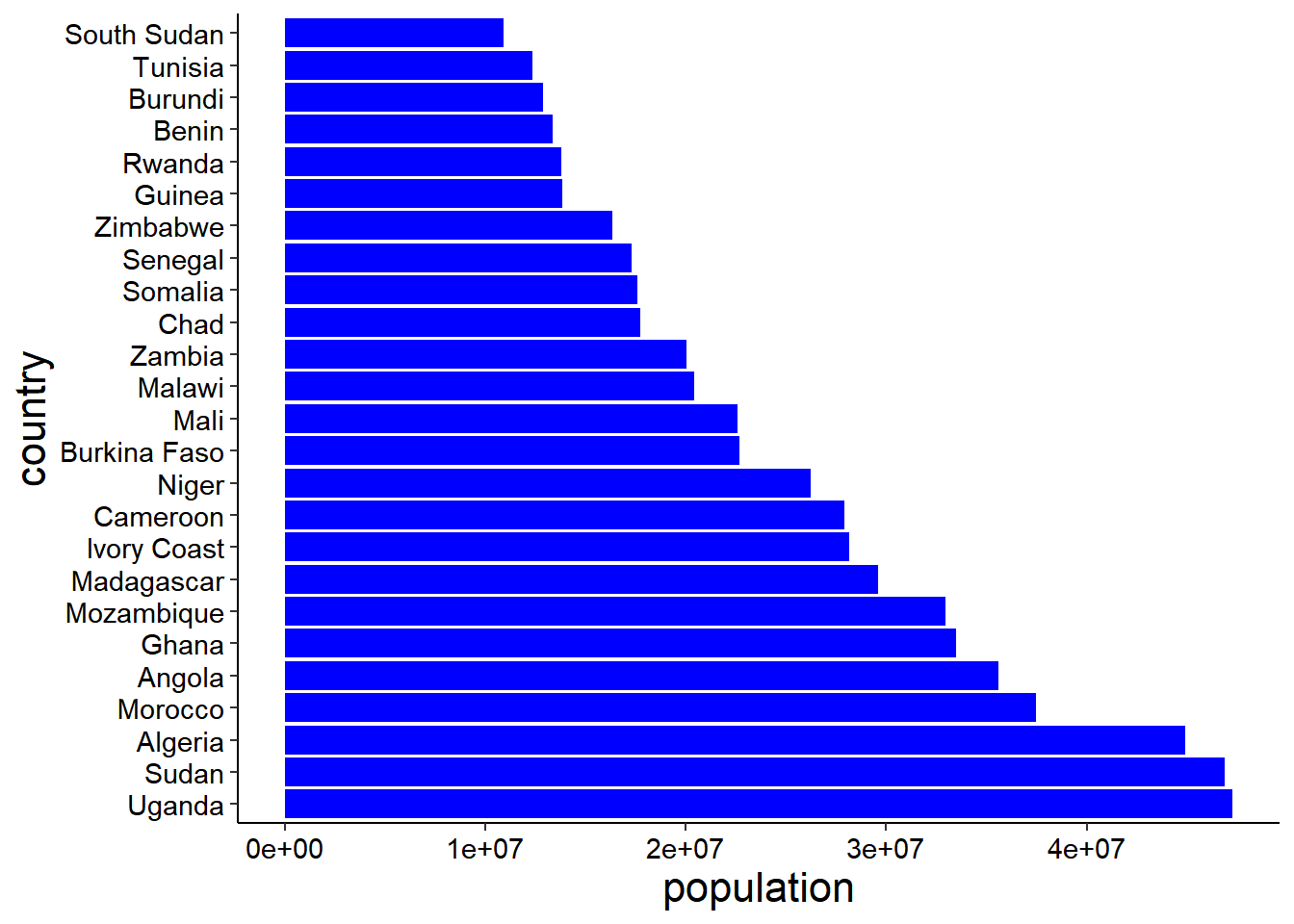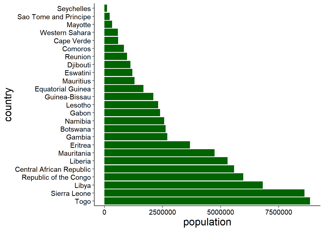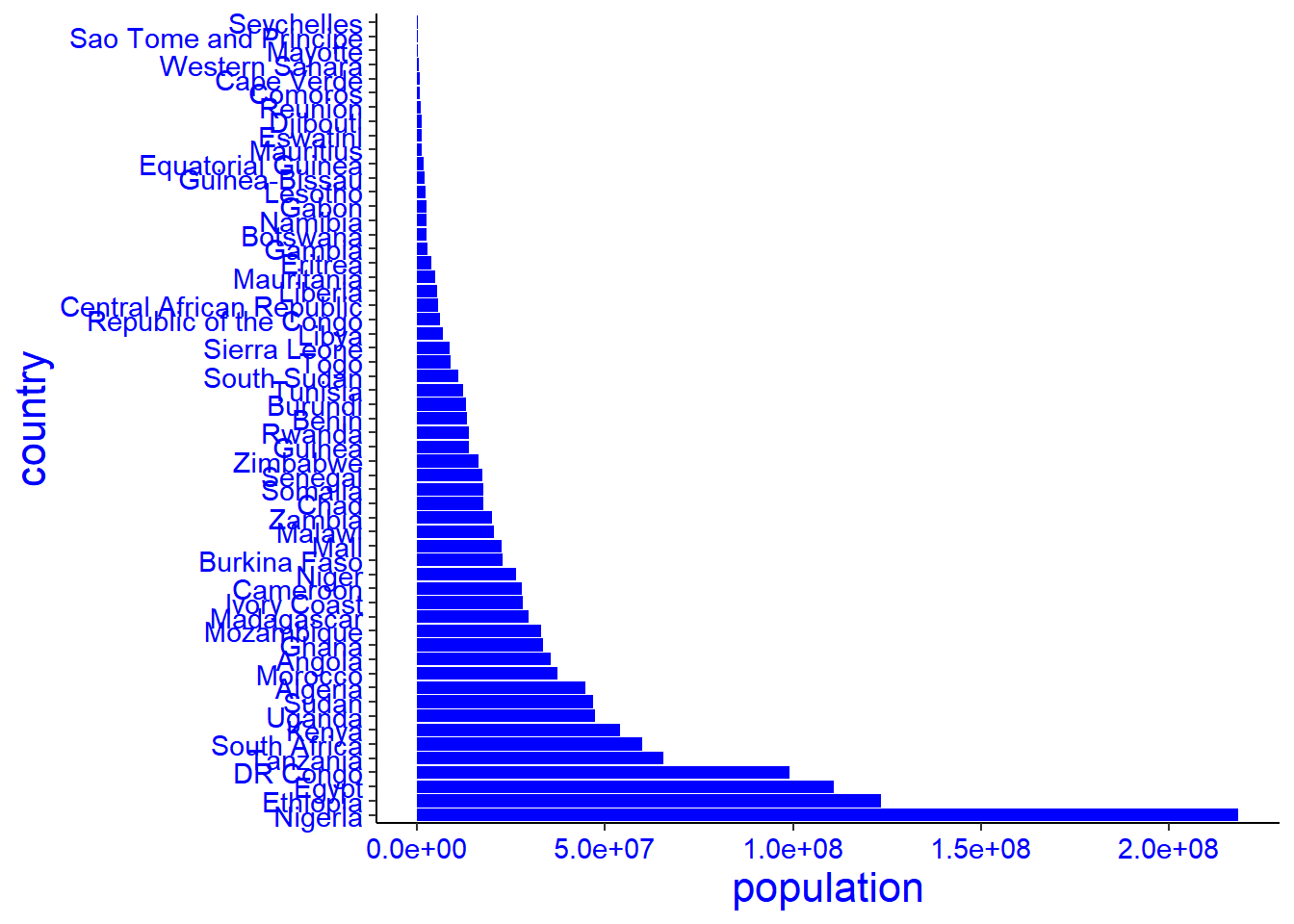 The graphs below show Africa continent population from high to low level, graph number one is not well arranged, sample were entered to the database the way they were collected, in fact without consideration of proper arrangement from the highest to the lowest number, it shows the original data, so we had to arranged it in an order that can be proper viewed In graph number two in ascending order. We use the function reorder() of the package tidyverse.