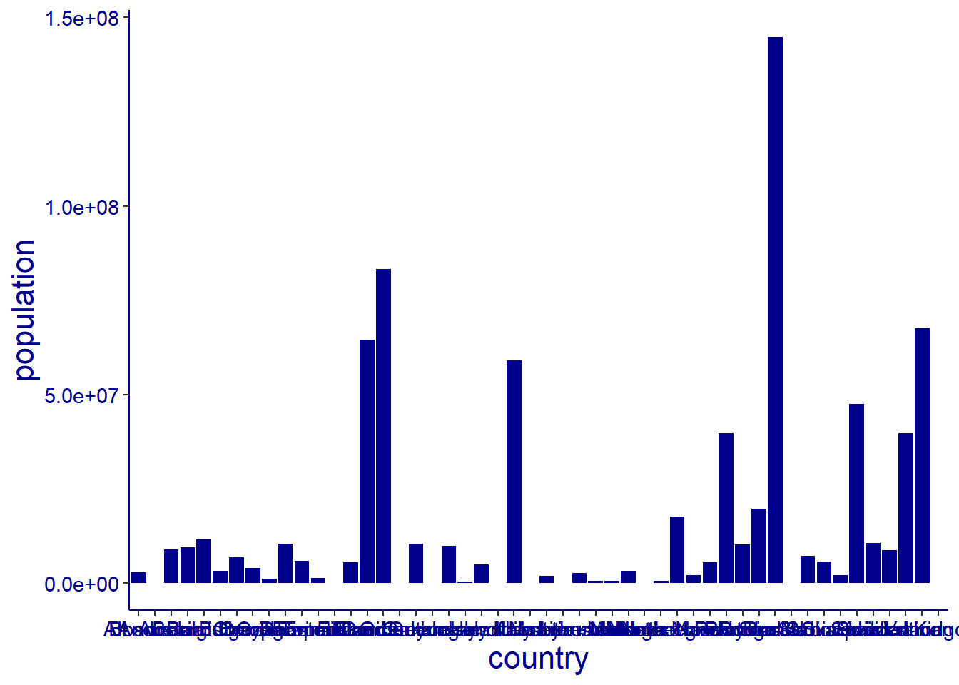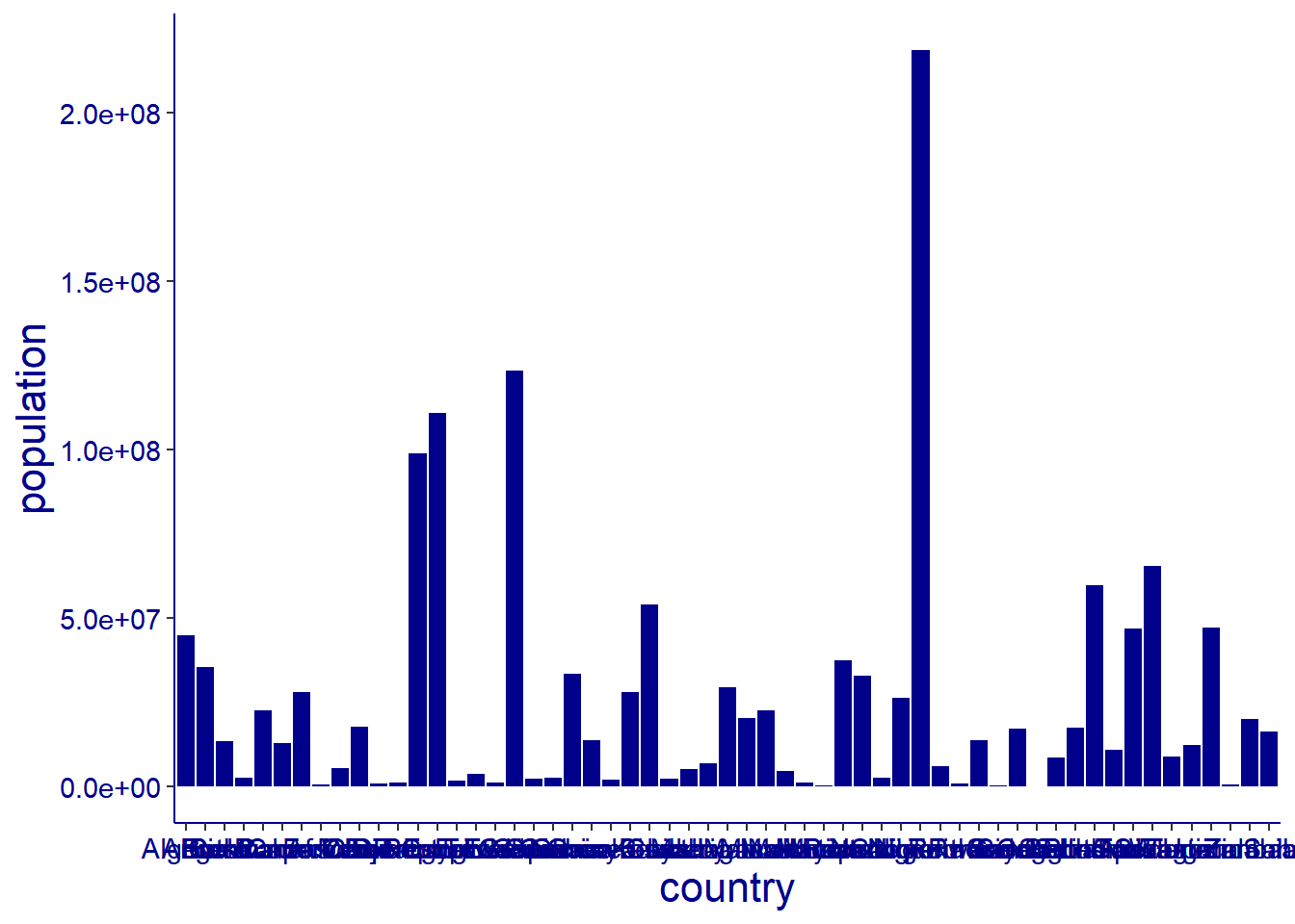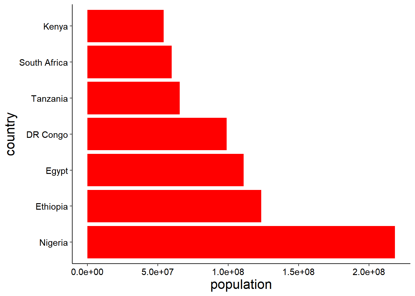The graphs below show Africa continent population from high to low level, graph number one is not well arranged, sample were entered to the database the way they were collected, in fact without consideration of proper arrangement from the highest to the lowest number, it shows the original data, so we had to arranged it in an order that can be proper viewed In graph number two in ascending order. We use the function reorder() of the package tidyverse.