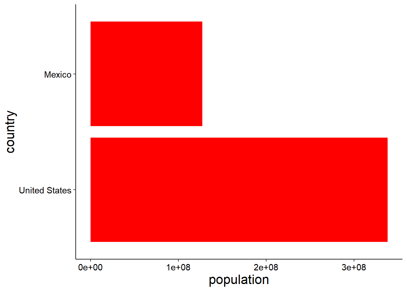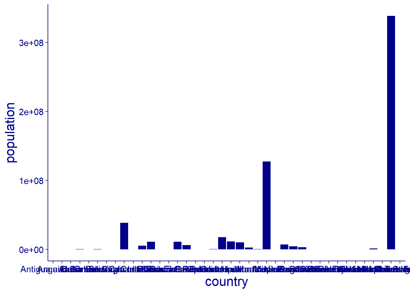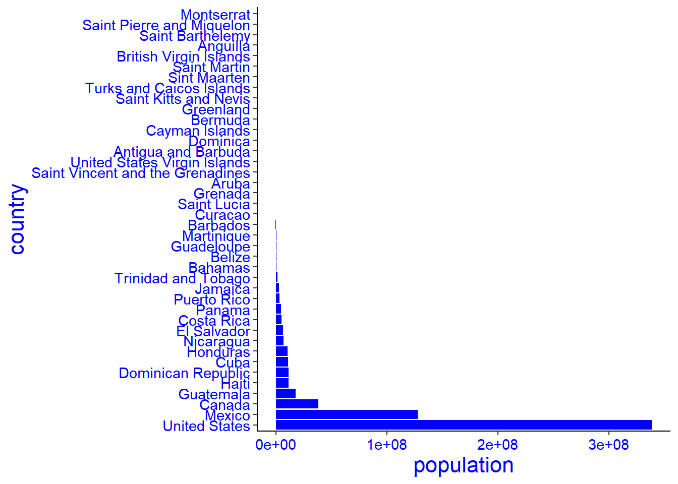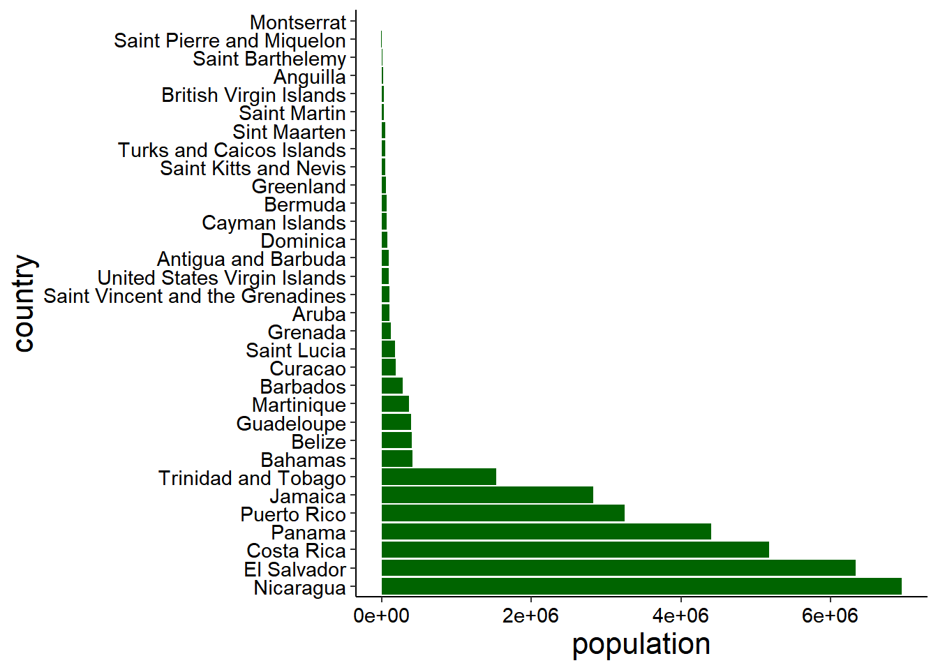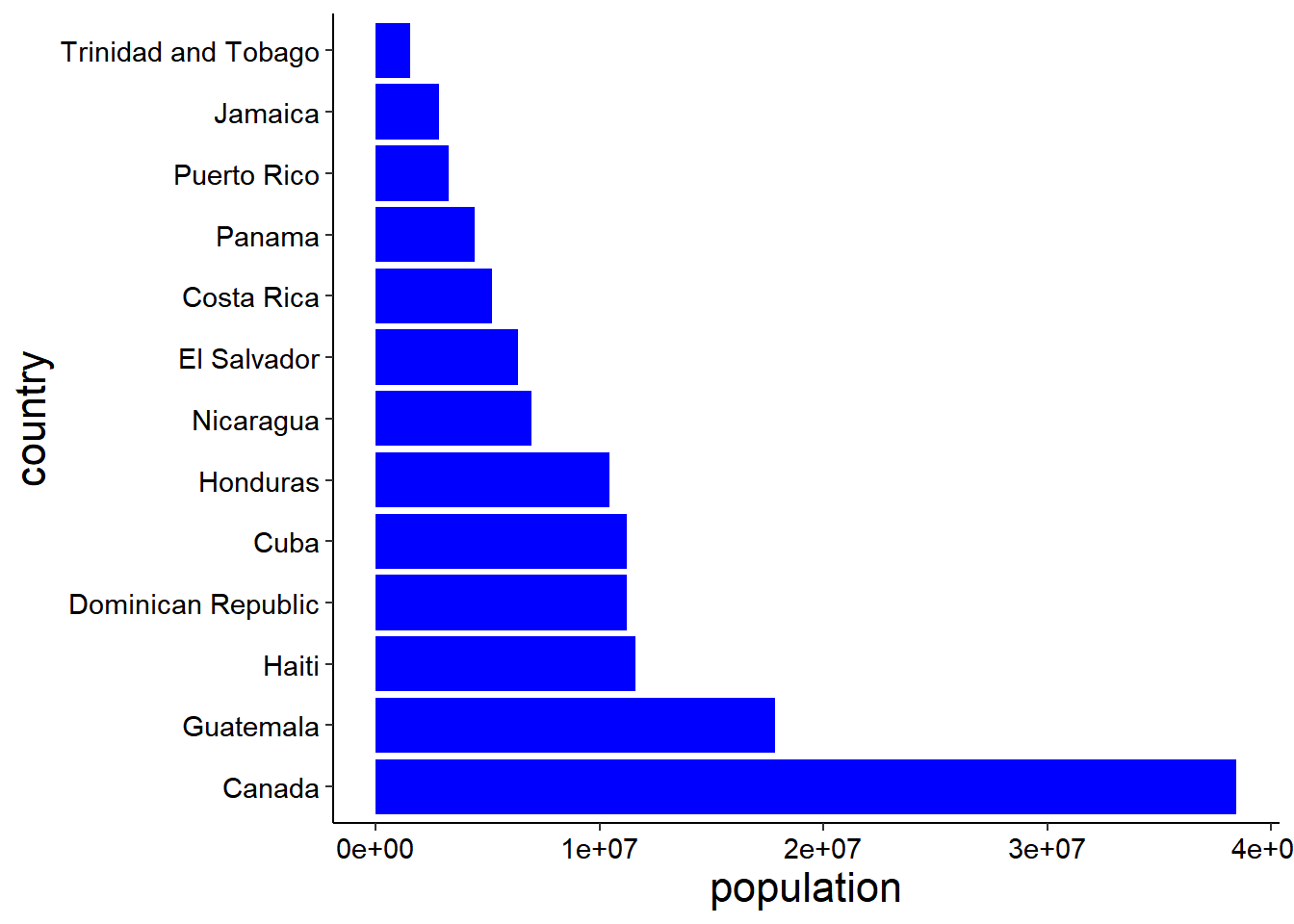 The graphs below show North America continent population from high to low level, graph number one is not well arranged, sample were entered to the database the way they were collected, in fact without consideration of proper arrangement from the highest to the lowest number, it shows the original data, so we had to arranged it in an order that can be proper viewed In graph number two in ascending order. We use the function reorder() of the package tidyverse.