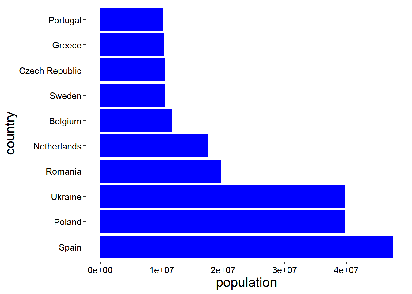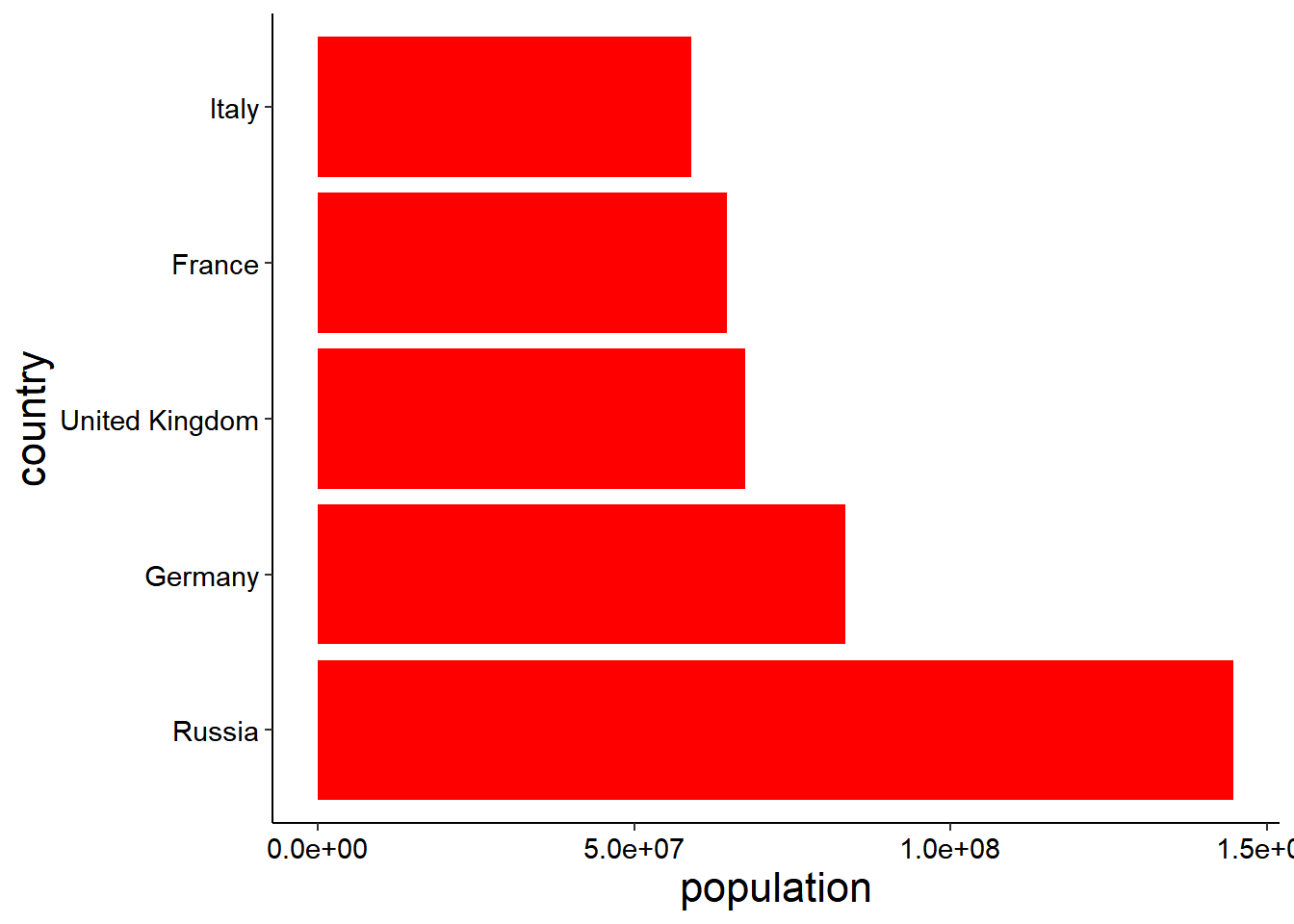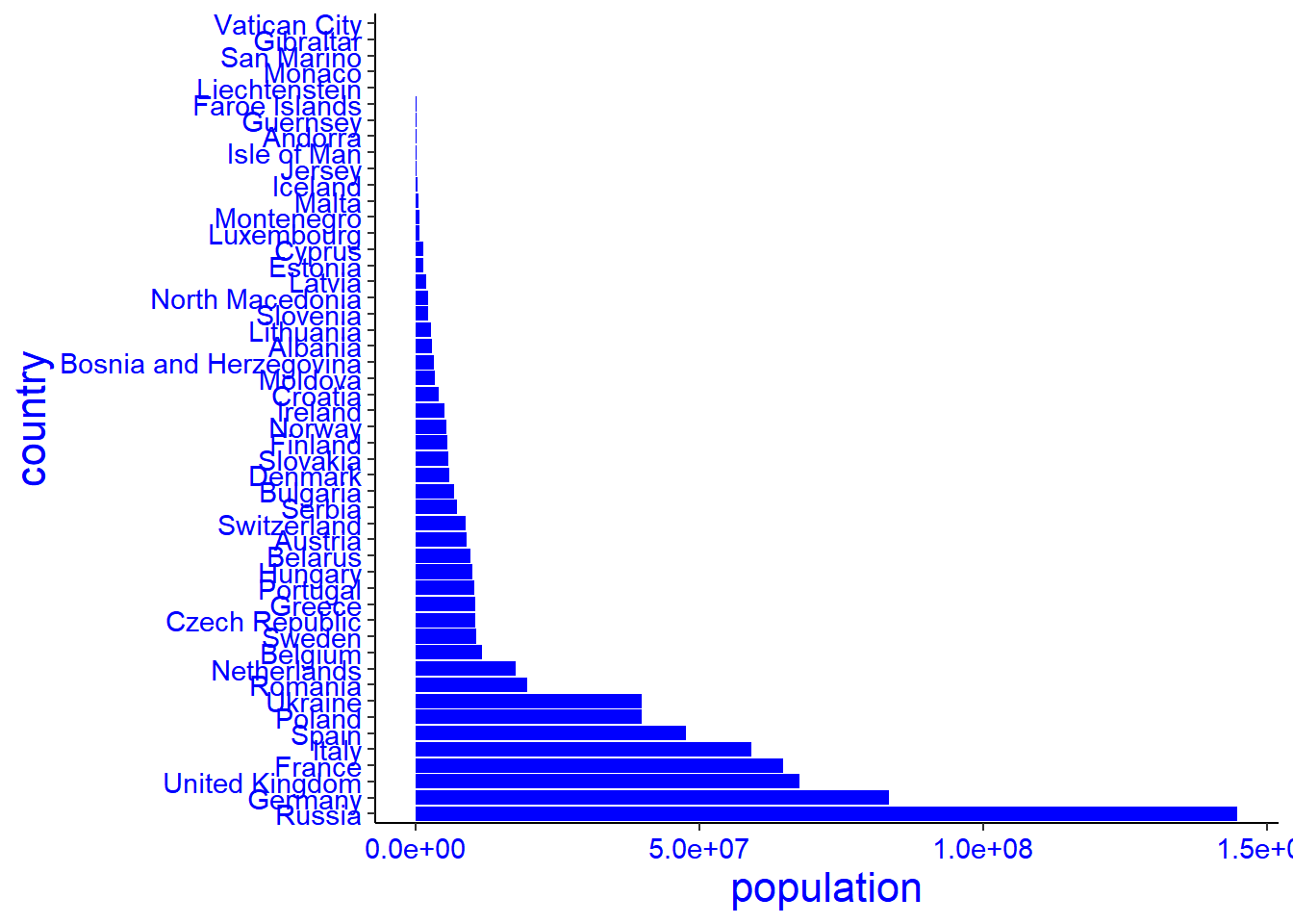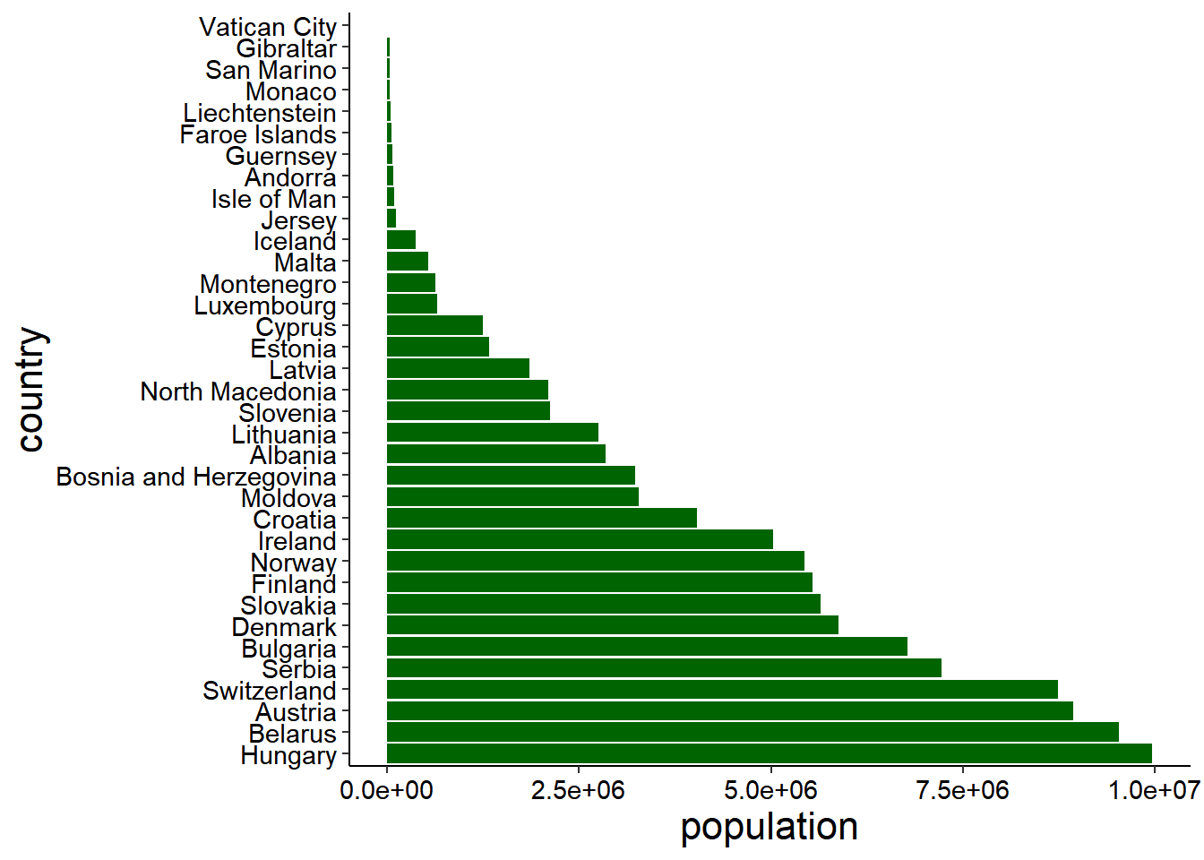 The graphs below show Europe continent population from high to low level, graph number one is not well arranged, sample were entered to the database the way they were collected, in fact without consideration of proper arrangement from the highest to the lowest number, it shows the original data, so we had to arranged it in an order that can be proper viewed In graph number two in ascending order. We use the function reorder() of the package tidyverse.