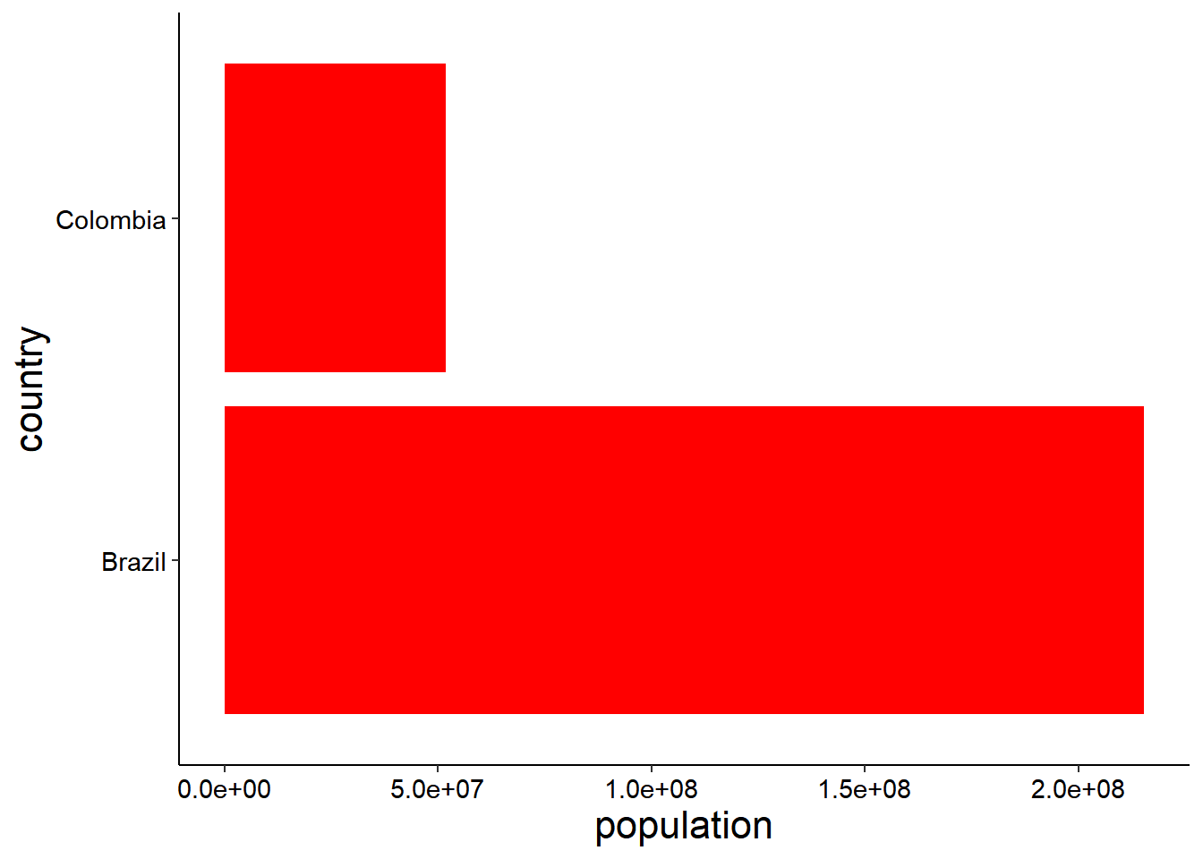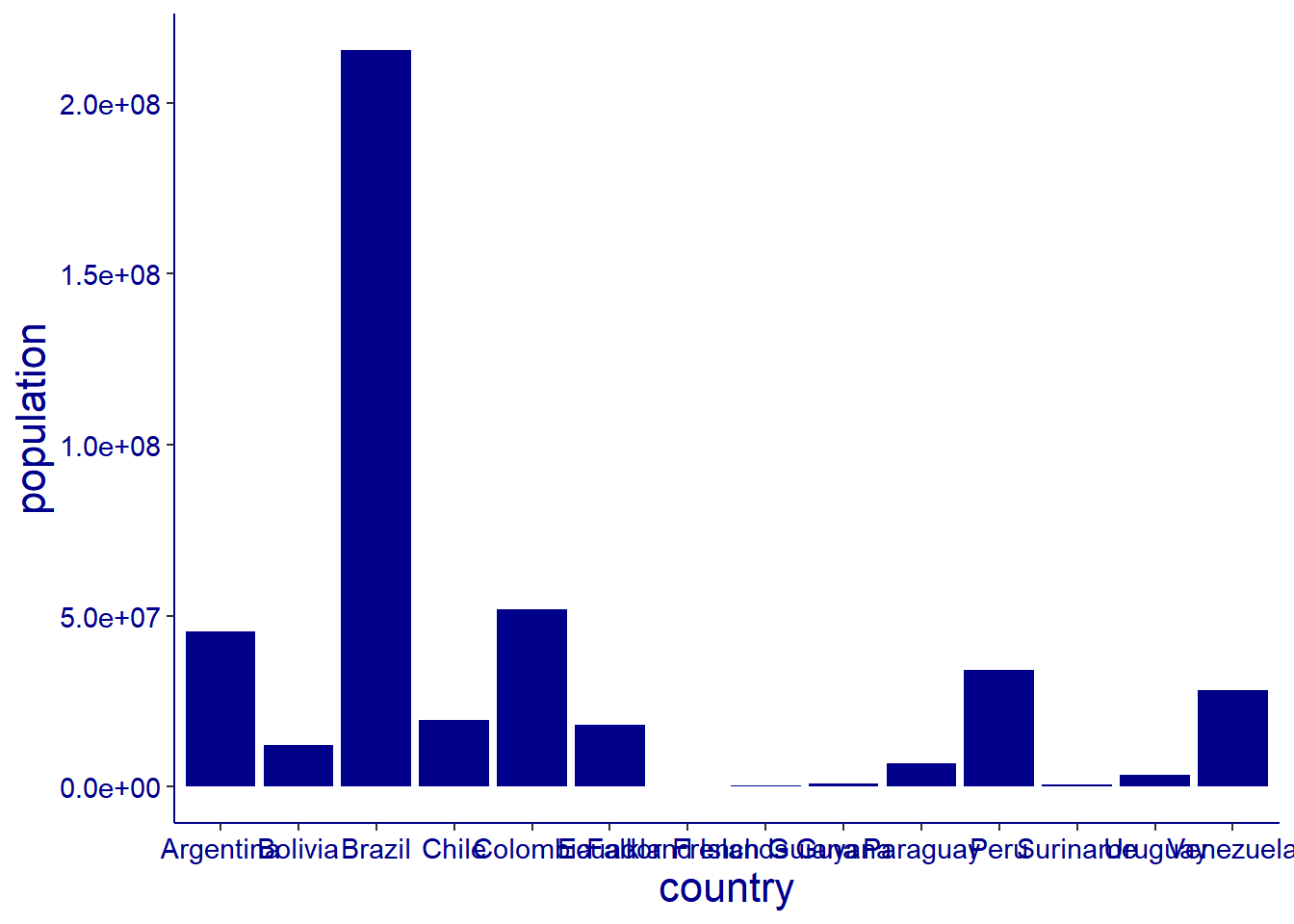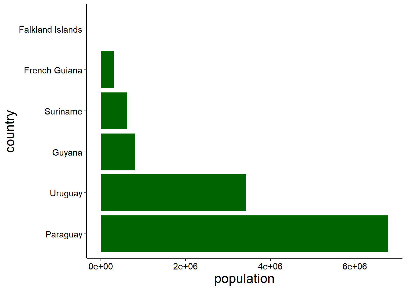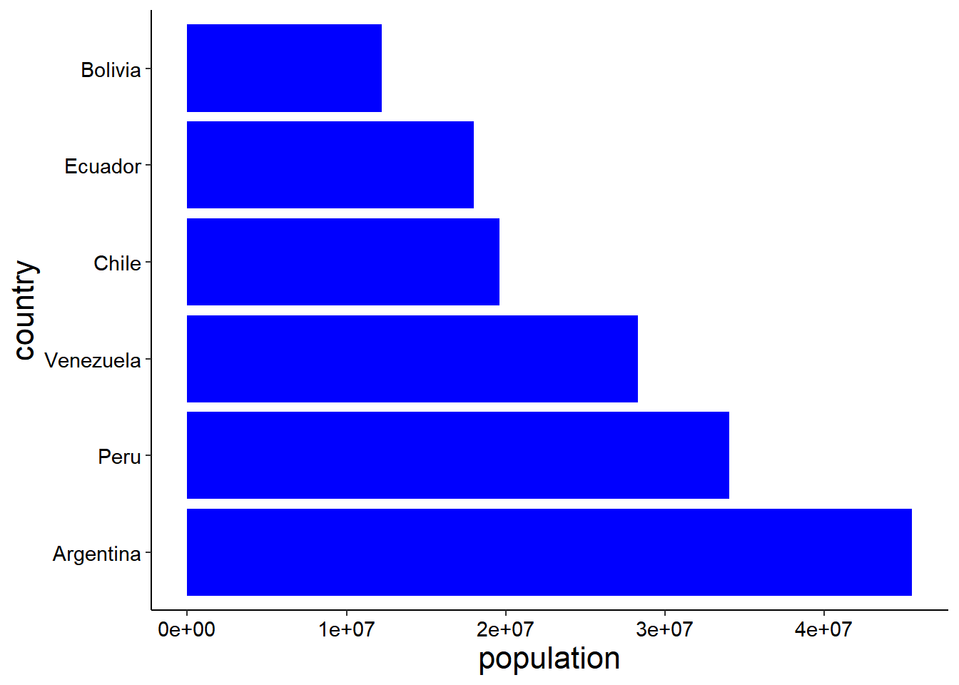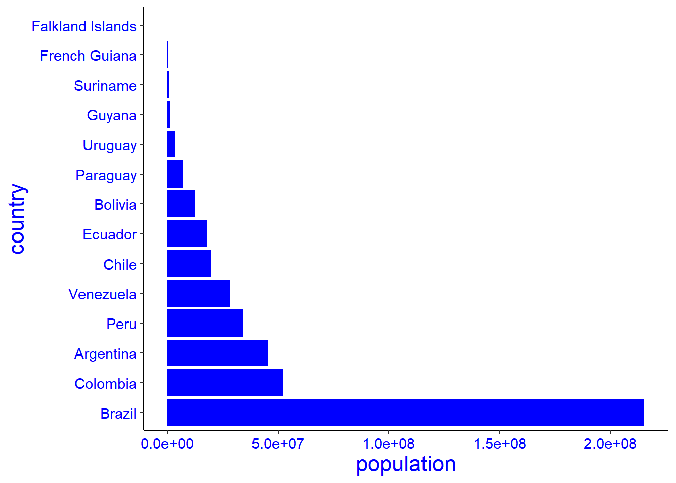 The graphs below show South America continent population from high to low level, graph number one is not well arranged, sample were entered to the database the way they were collected, in fact without consideration of proper arrangement from the highest to the lowest number, it shows the original data, so we had to arranged it in an order that can be proper viewed In graph number two in ascending order. We use the function reorder() of the package tidyverse.