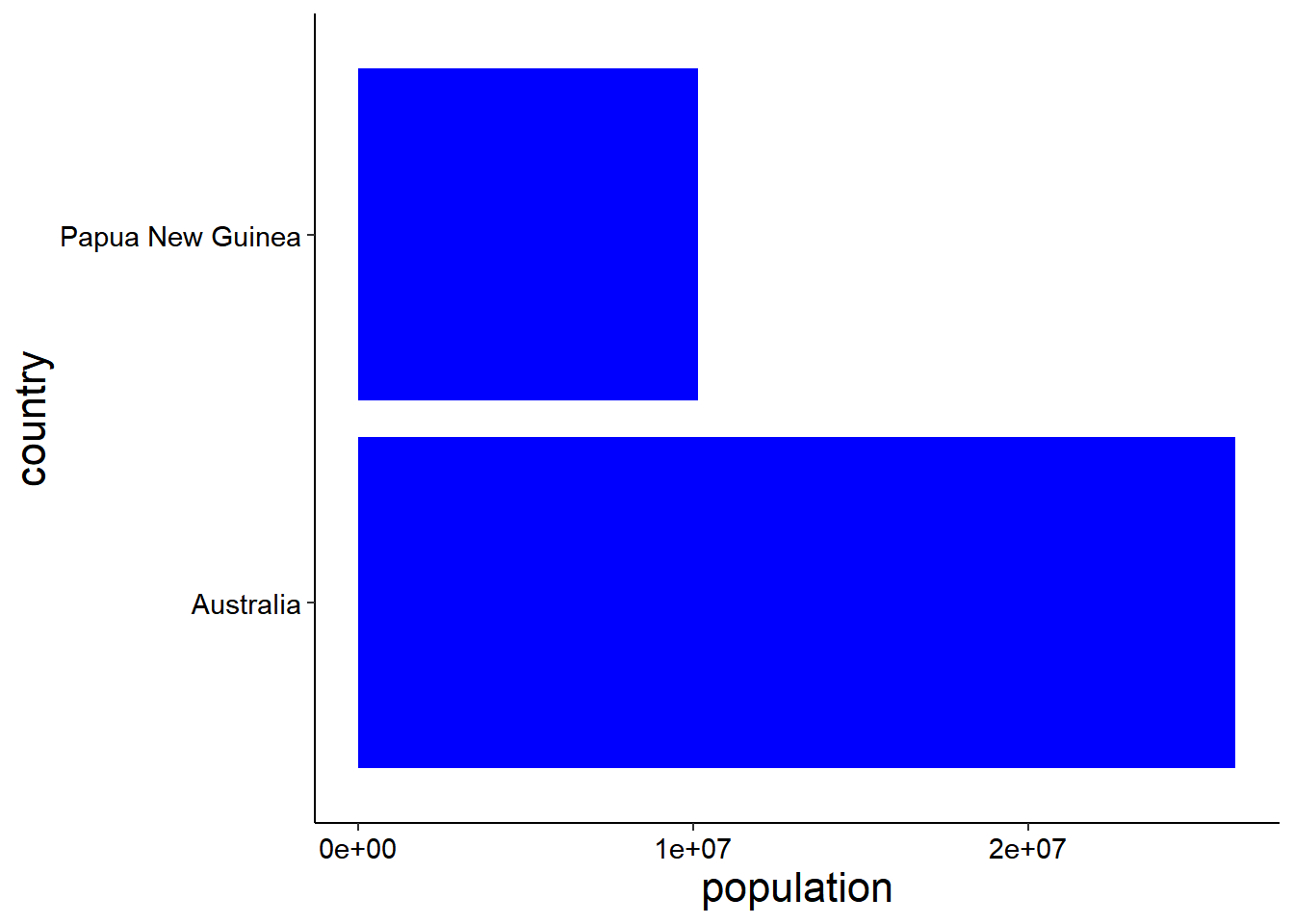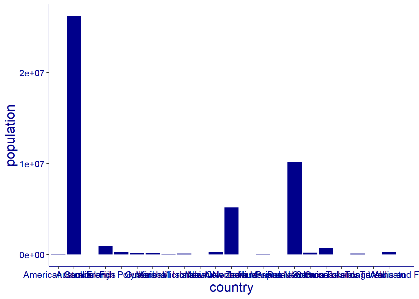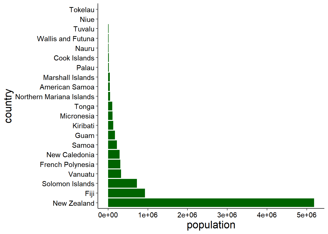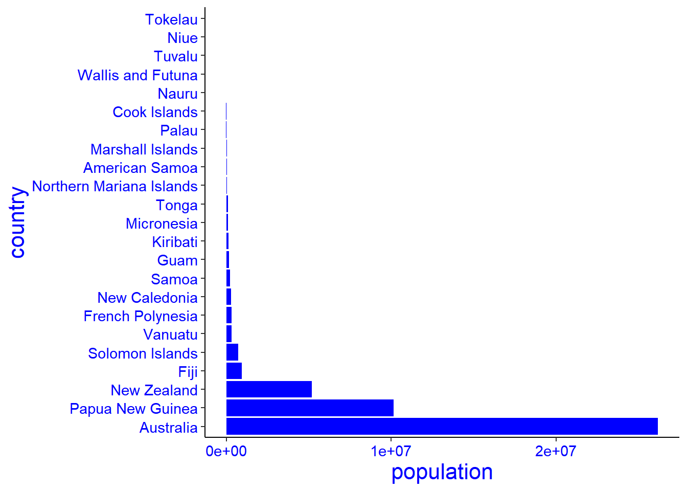 The graphs below show Oceania continent population from high to low level, graph number one is not well arranged, sample were entered to the database the way they were collected, in fact without consideration of proper arrangement from the highest to the lowest number, it shows the original data, so we had to arranged it in an order that can be proper viewed In graph number two in ascending order. We use the function reorder() of the package tidyverse.
