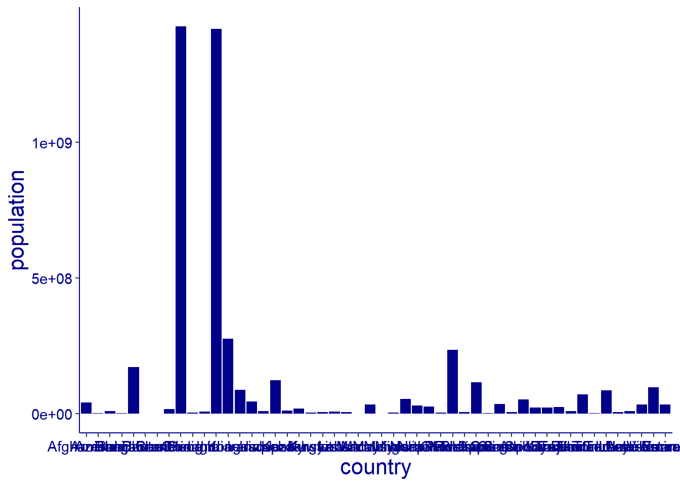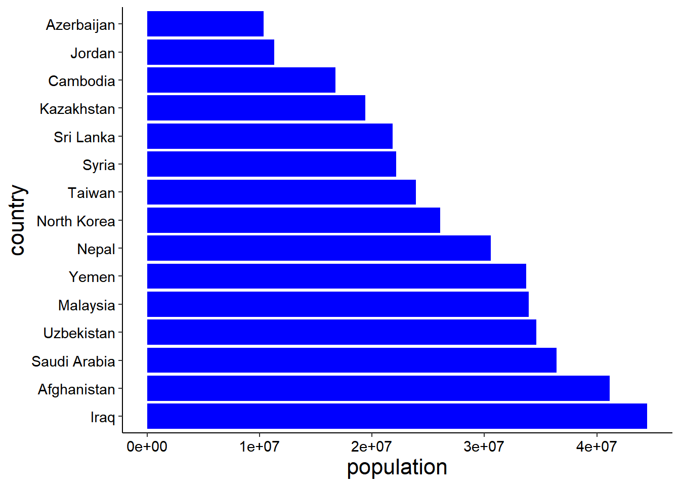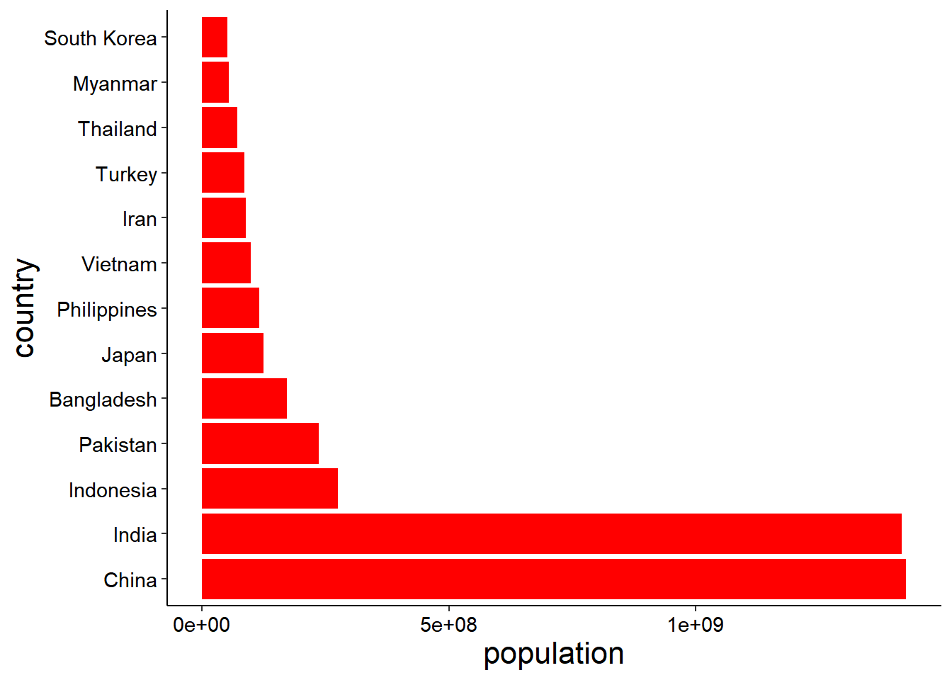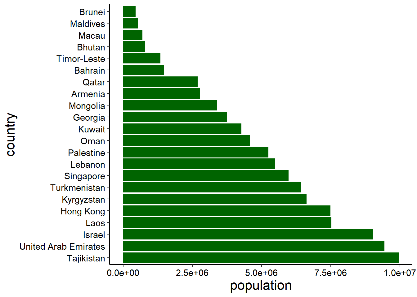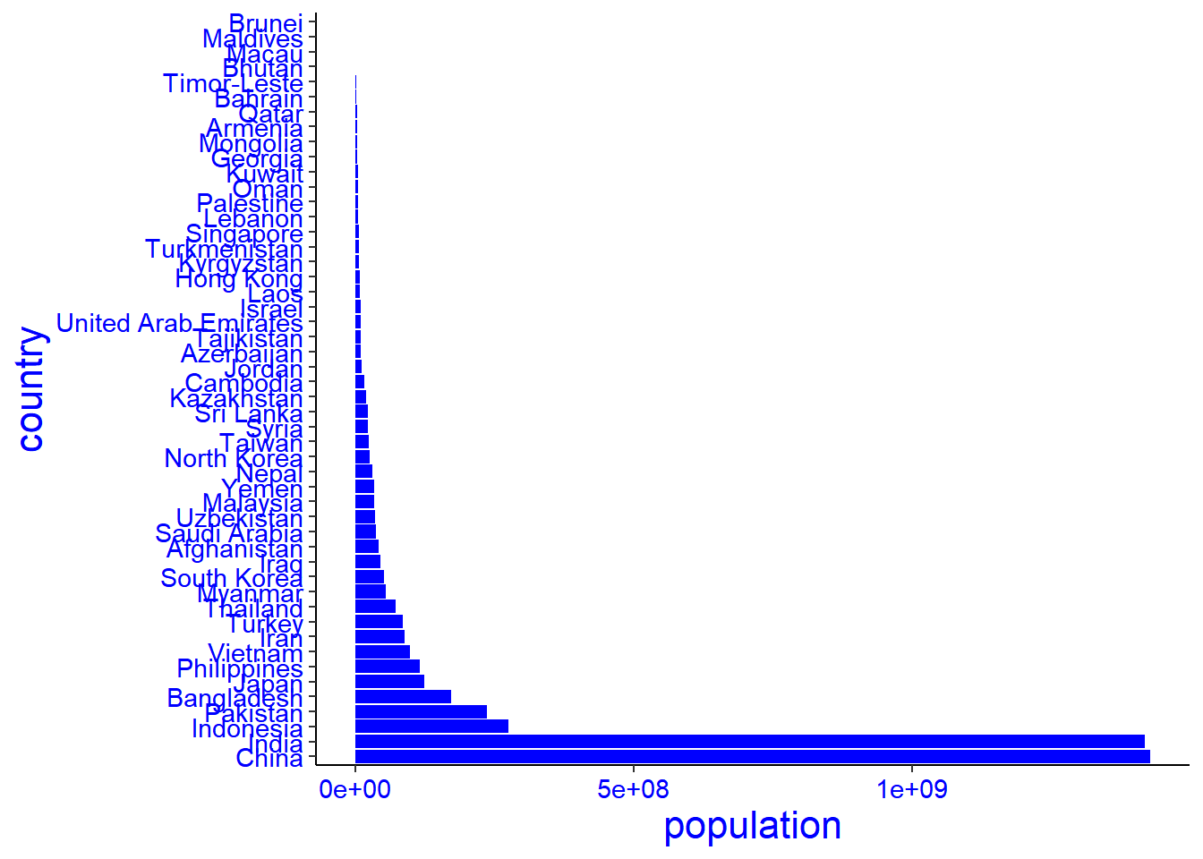 The graphs below show Asian continent population from high to low level, graph number one is not well arranged, sample were entered to the database the way they were collected, in fact without consideration of proper arrangement from the highest to the lowest number, it shows the original data, so we had to arranged it in an order that can be proper viewed In graph number two in ascending order. We use the function reorder() of the package tidyverse.